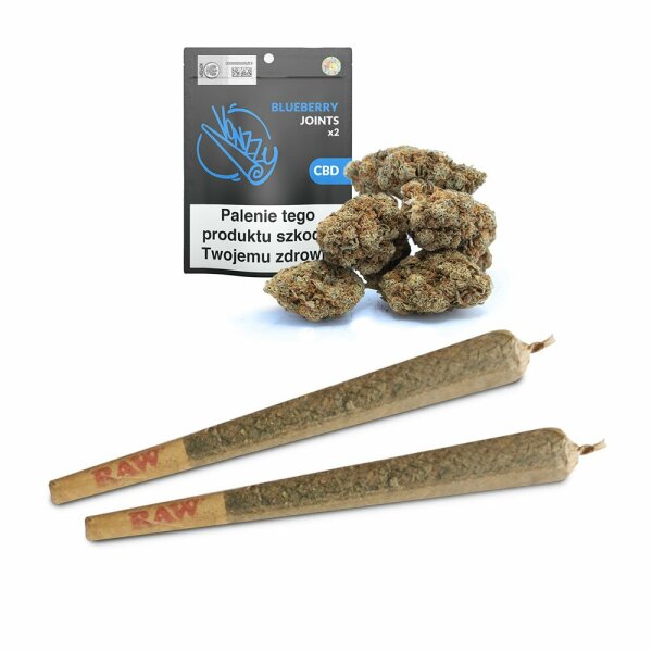 Susz konopny Vonzzy JOINTS Blueberry to rozdrobnione, ręcznie selekcjonowane kwiaty Cannabis Sativa L w automatycznie zwiniętych naturalnych bibułkach RAW stanowiących mieszankę włókien niechlorowanych i niewybielanych. Gotowe do palenia.