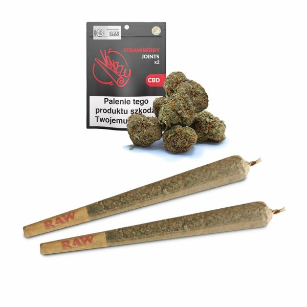 Susz konopny Vonzzy JOINTS Strawberry to rozdrobnione, ręcznie selekcjonowane kwiaty Cannabis Sativa L w automatycznie zwiniętych naturalnych bibułkach RAW stanowiących mieszankę włókien niechlorowanych i niewybielanych. Gotowe do palenia.